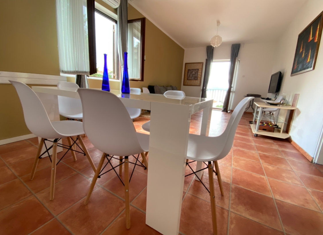 Welcome to our spacious apartment, perfect for accommodating up to 6 guests. Featuring a cozy living room and two bedrooms, you'll enjoy stunning sea views from two of the rooms and a tranquil garden view from the. The apartment boasts a large terrace with a BBQ area, along heating and air conditioning in every room for your comfort. Experience the perfect blend of relaxation and convenience during your stay!